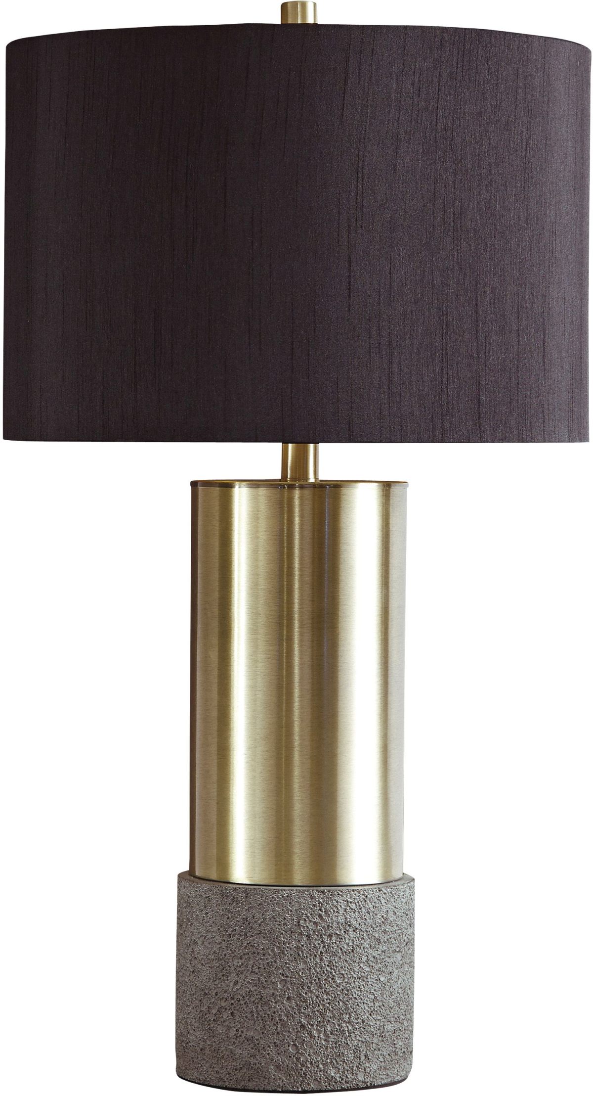 Faux concrete sets the stage for this ultra-contemporary brass-tone table lamp. This substantial lamp is topped with a chic all-black shade and a gold-tone foil interior for an elegant aesthetic.Read More